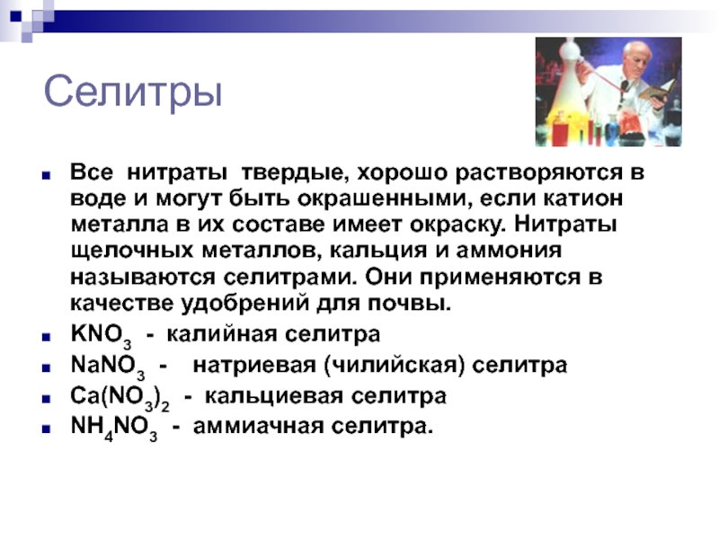 щелочных металлов, кальция и аммония называются селитрами. Они применяются в качестве удобрений для почвы.