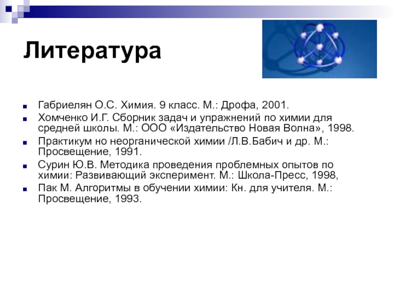 Габриелян О.С. Химия. 9 класс. М.: Дрофа, 2001.