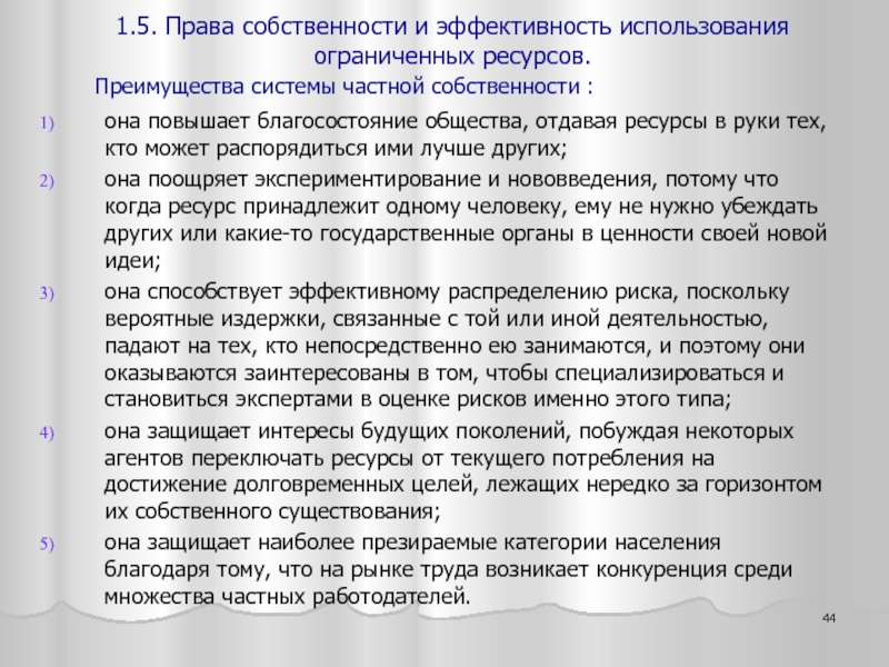 Слайд 441.5. Права собственности и эффективность использования ограниченных ресурсов.