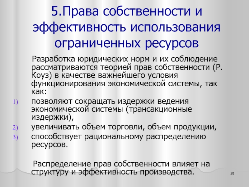Слайд 37 Права собственности действуют как своеобразные стимулы, увеличивая