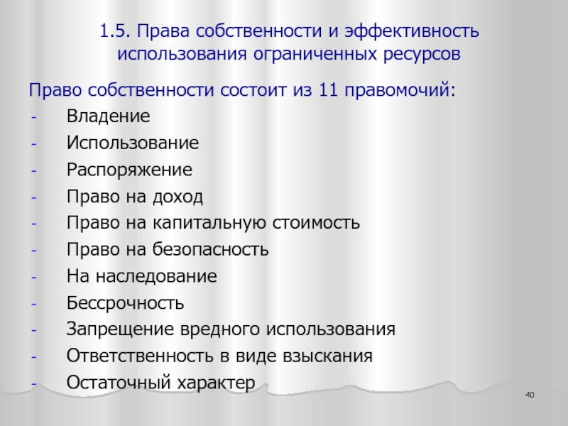 Слайд 401.5. Права собственности и эффективность использования ограниченных ресурсов
