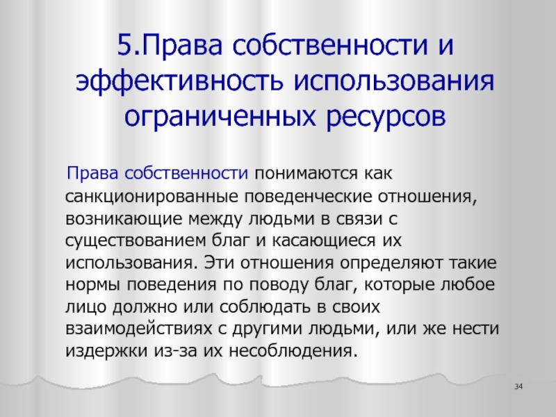 Слайд 34 Права собственности понимаются как санкционированные поведенческие отношения,