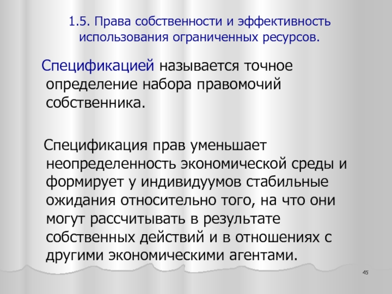 Слайд 451.5. Права собственности и эффективность использования ограниченных ресурсов.