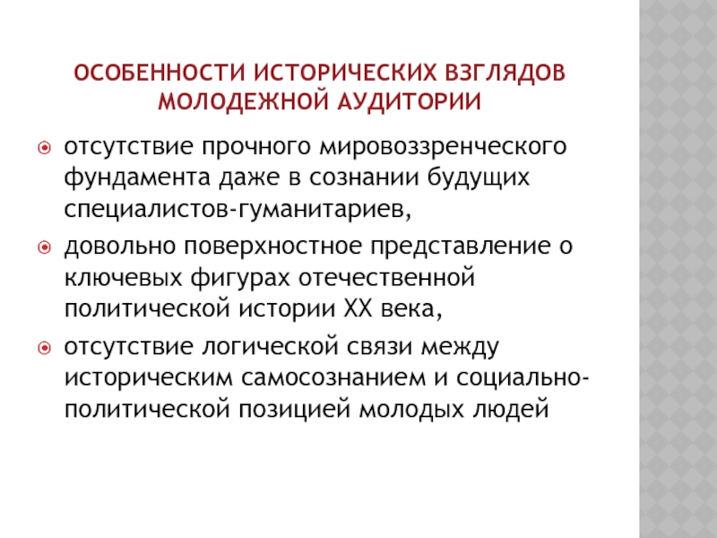 Особенности исторических взглядов молодежной аудиторииотсутствие прочного мировоззренческого фундамента даже в сознании будущих специалистов-гуманитариев, довольно поверхностное представление о