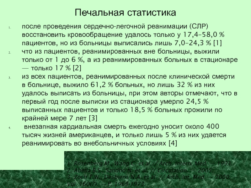 что из пациентов, реанимированных вне больницы, выжили только от 1 до 6 %, а из реанимированных больных в стационаре — только 17 % [2]
