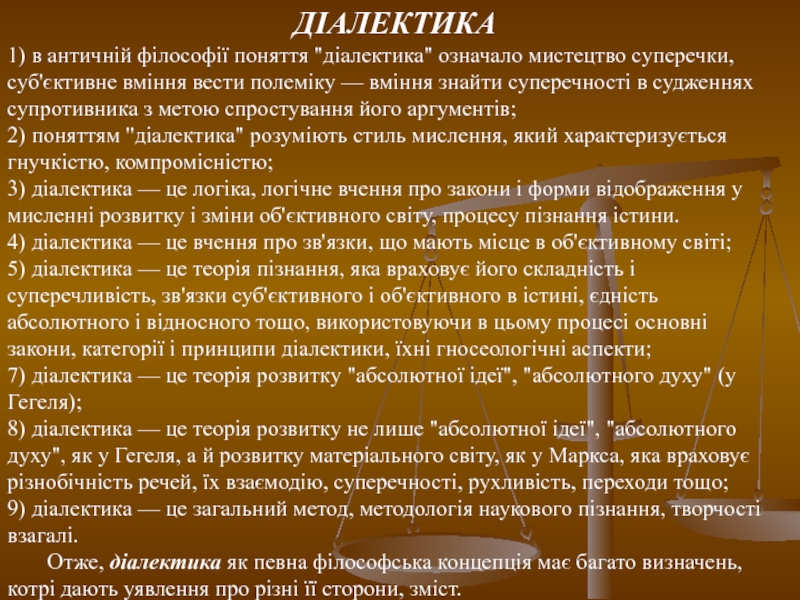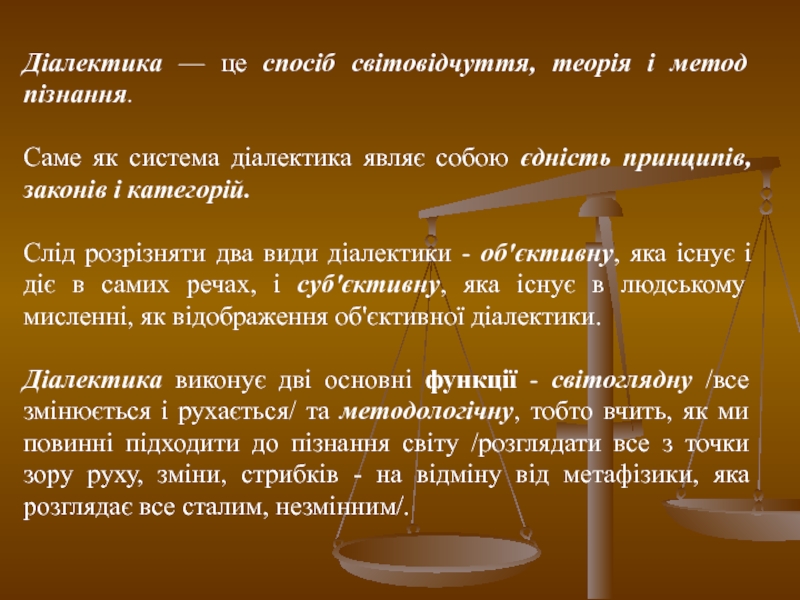 Слайд 39Діалектика — це спосіб світовідчуття, теорія і метод пізнання.