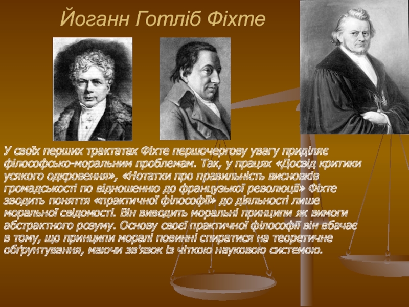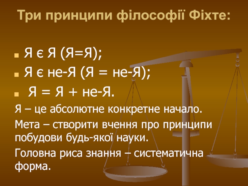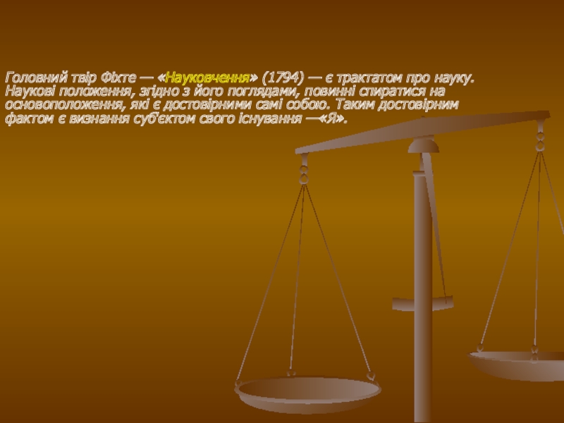 Слайд 8Головний твір Фіхте — «Науковчення» (1794) — є трактатом про науку. Наукові положення, згідно
