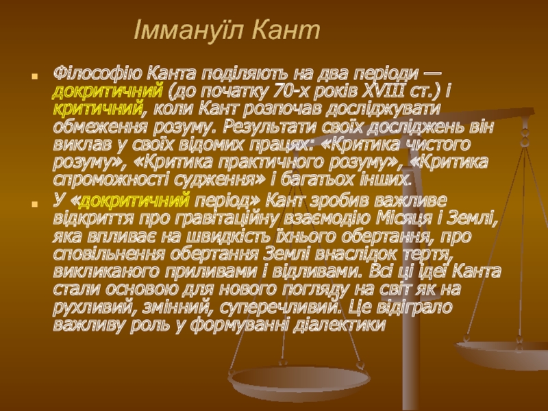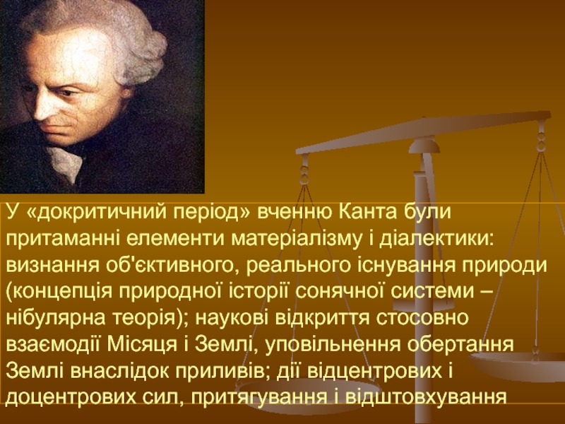 Слайд 15У «докритичний період» вченню Канта були притаманні елементи матеріалізму і діалектики: визнання