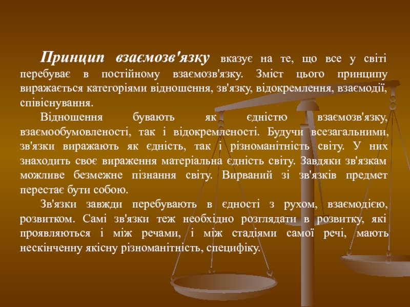 в постійному взаємозв'язку. Зміст цього принципу виражається категоріями відношення, зв'язку,