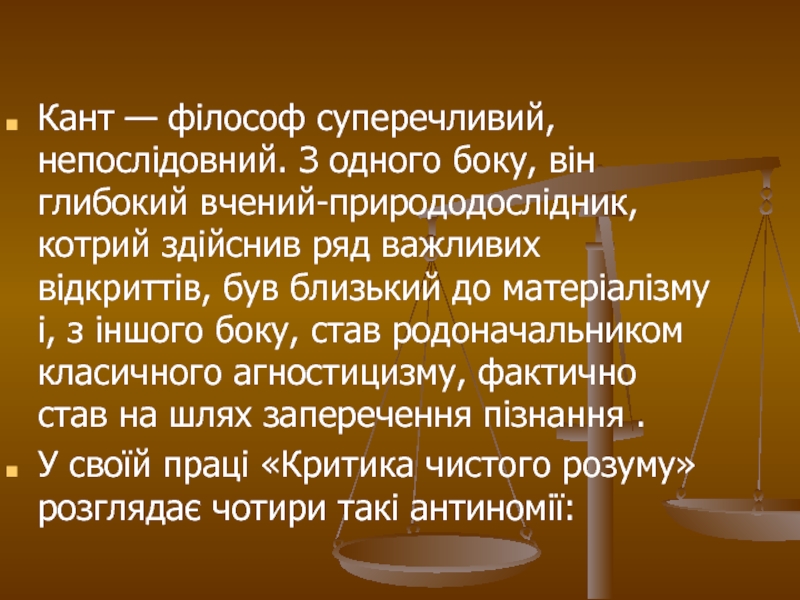 Слайд 18Кант — філософ суперечливий, непослідовний. З одного боку, він глибокий вчений-природодослідник,