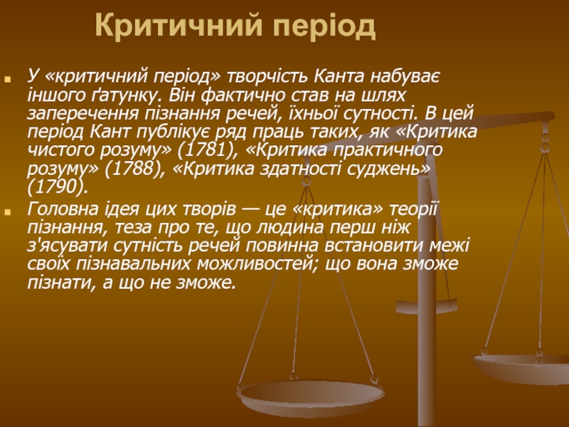 70-х років XVIII ст.) і критичний, коли Кант розпочав досліджувати обмеження розуму. Результати