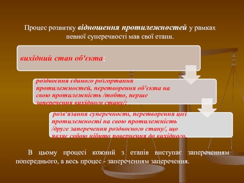 Слайд 38Процес розвитку відношення протилежностей у рамках певної суперечності мав свої