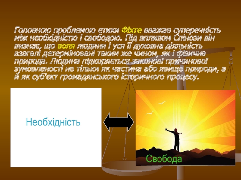 Слайд 9Головною проблемою етики Фіхте вважав суперечність між необхідністю і свободою.