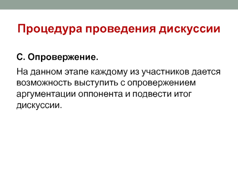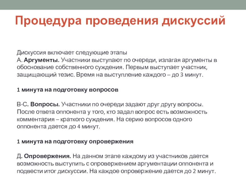 Д. Опровержения. На данном этапе каждому из участников дается возможность выступить с опровержением аргументации оппонента и подвести итог дискуссии. На каждое опровержение дается до 2 минут.