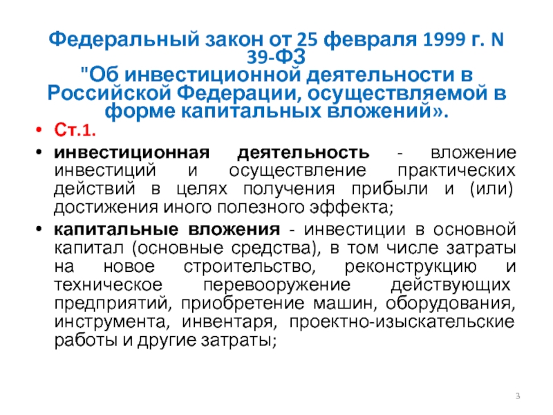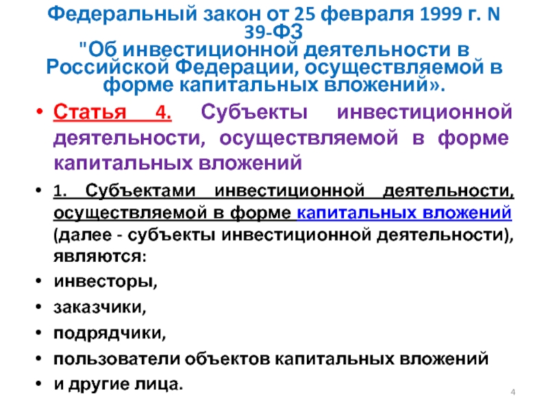 Слайд 4Федеральный закон от 25 февраля 1999 г. N 39-ФЗ