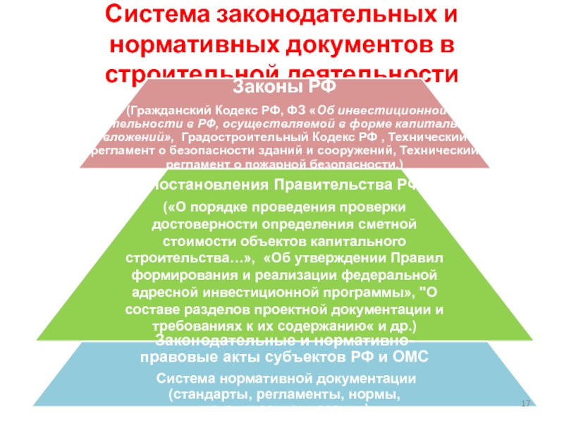 Слайд 17Система законодательных и нормативных документов в строительной деятельности