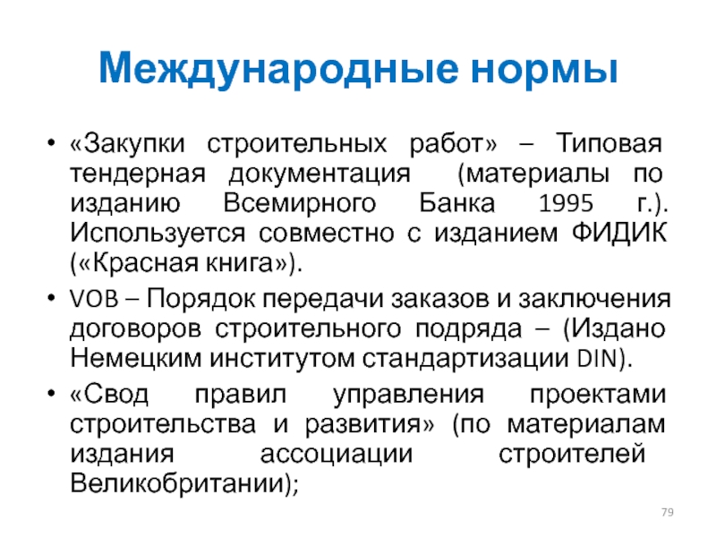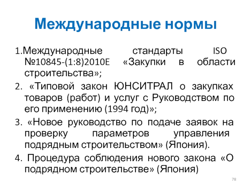 1.Международные стандарты ISO №10845-(1:8)2010E «Закупки в области строительства»;