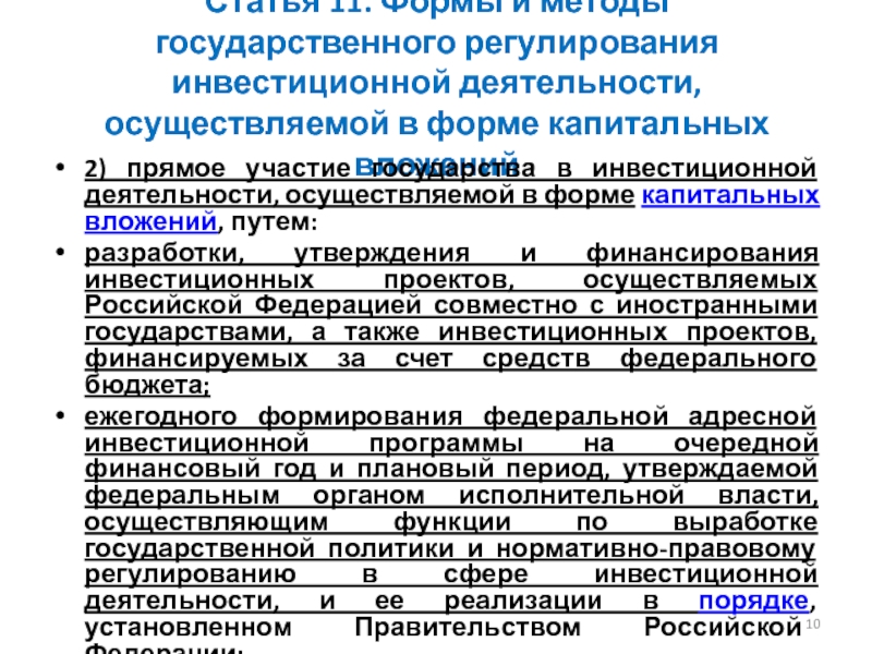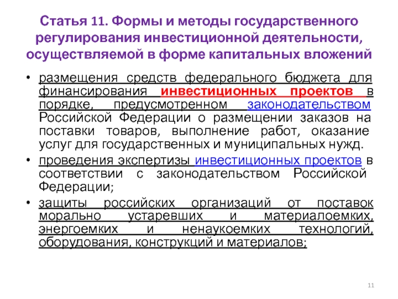Статья 11. Формы и методы государственного регулирования инвестиционной деятельности, осуществляемой