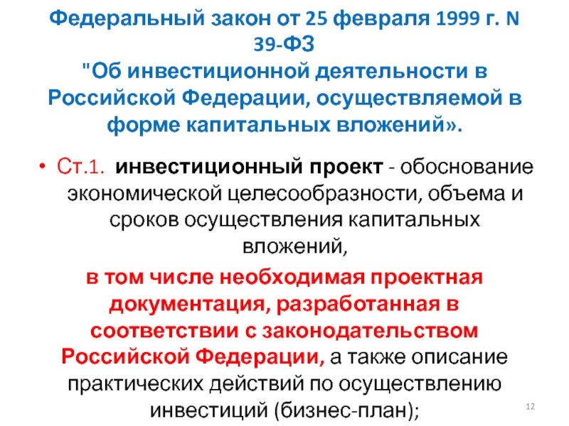 Слайд 12Федеральный закон от 25 февраля 1999 г. N 39-ФЗ