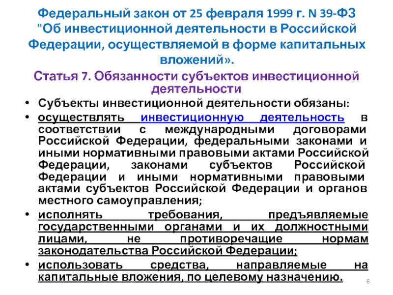 Слайд 8Федеральный закон от 25 февраля 1999 г. N 39-ФЗ