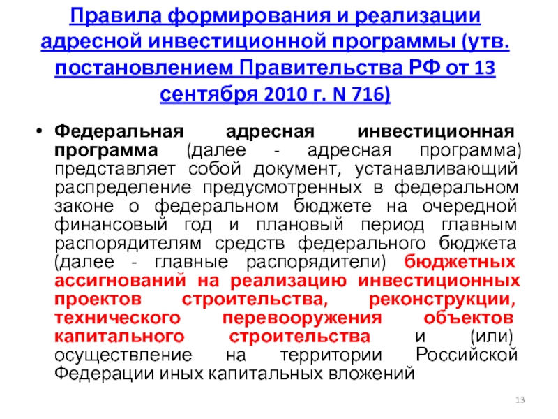 - адресная программа) представляет собой документ, устанавливающий распределение предусмотренных в федеральном законе о федеральном бюджете на очередной финансовый год и плановый период главным распорядителям средств федерального бюджета (далее - главные распорядители) бюджетных ассигнований на реализацию инвестиционных проектов строительства, реконструкции, технического перевооружения объектов капитального строительства и (или) осуществление на территории Российской Федерации иных капитальных вложений