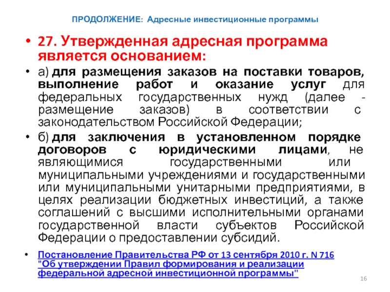 Слайд 16ПРОДОЛЖЕНИЕ: Адресные инвестиционные программы