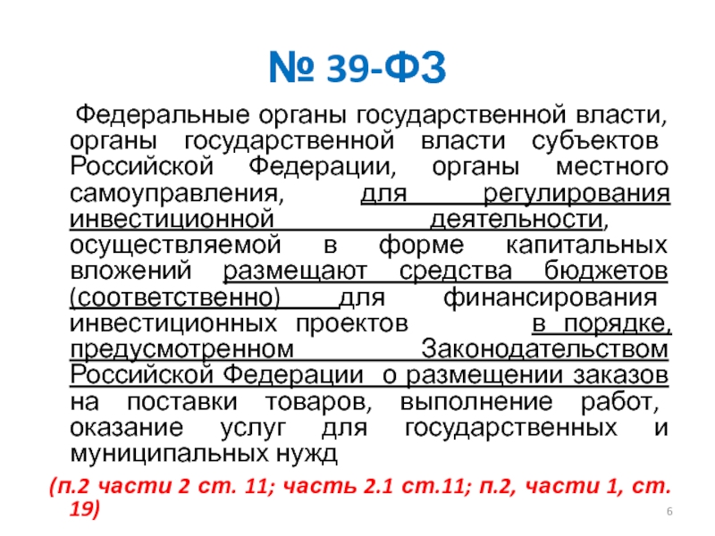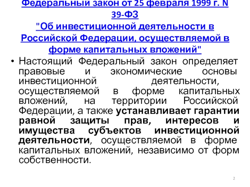 Слайд 2Федеральный закон от 25 февраля 1999 г. N 39-ФЗ