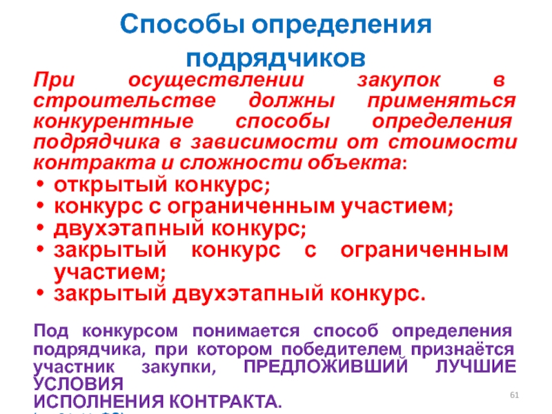 Подрядчики - физические и юридические лица, которые выполняют работы по договору подряда и (или) государственному или муниципальному контракту, заключаемым с заказчиками в соответствии с Гражданским кодексом Российской Федерации. Подрядчики обязаны иметь лицензию на осуществление ими тех видов деятельности, которые подлежат лицензированию в соответствии с федеральным законом.