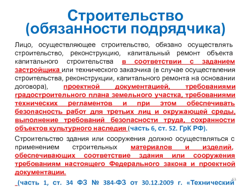 процессов строительства, монтажа, наладки в форме, предусмотренной пунктом 5 части 1 настоящей статьи, осуществляется лицом, осуществившим строительство (лицом, осуществившим строительство, и застройщиком (заказчиком) в случае осуществления строительства на основании договора), путем подписания документа, подтверждающего соответствие построенного, реконструированного или отремонтированного здания или сооружения проектной документации. (часть 4 ст. 39 ФЗ № 384 от 30.12.2009 г. «Технический регламент о безопасности зданий и сооружений»).