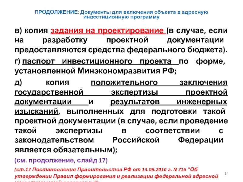 Слайд 14ПРОДОЛЖЕНИЕ: Документы для включения объекта в адресную инвестиционную программу