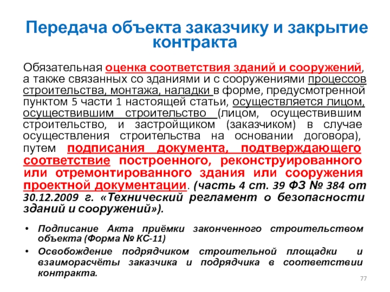 Слайд 77Передача объекта заказчику и закрытие контракта