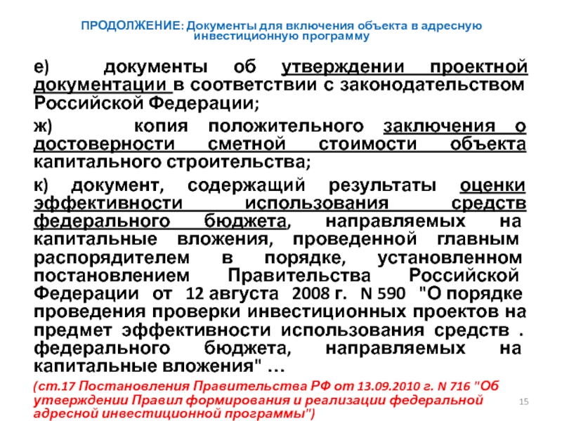 Слайд 15ПРОДОЛЖЕНИЕ: Документы для включения объекта в адресную инвестиционную программу