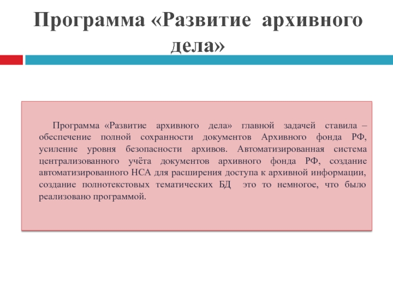 безопасности архивов. Автоматизированная система централизованного учёта документов архивного фонда РФ, создание автоматизированного НСА для расширения доступа к архивной информации, создание полнотекстовых тематических БД это то немногое, что было реализовано программой.