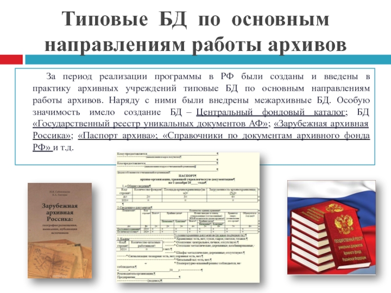 типовые БД по основным направлениям работы архивов. Наряду с ними были внедрены межархивные БД. Особую значимость имело создание БД – Центральный фондовый каталог; БД «Государственный реестр уникальных документов АФ»; «Зарубежная архивная Россика»; «Паспорт архива»; «Справочники по документам архивного фонда РФ» и т.д.