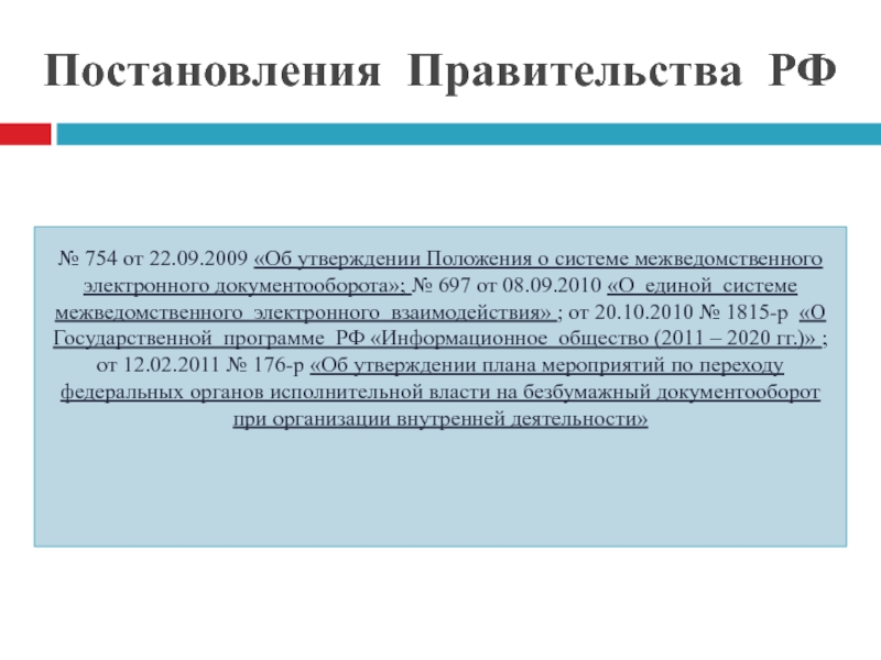 системе межведомственного электронного взаимодействия» ; от 20.10.2010 № 1815-р «О Государственной программе РФ «Информационное общество (2011 – 2020 гг.)» ; от 12.02.2011 № 176-р «Об утверждении плана мероприятий по переходу федеральных органов исполнительной власти на безбумажный документооборот при организации внутренней деятельности»