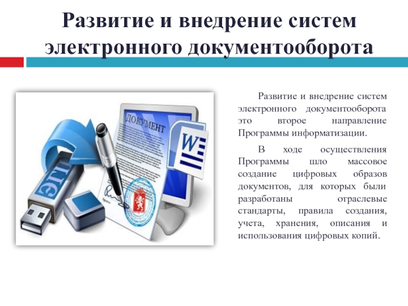 Слайд 13Развитие и внедрение систем электронного документооборота