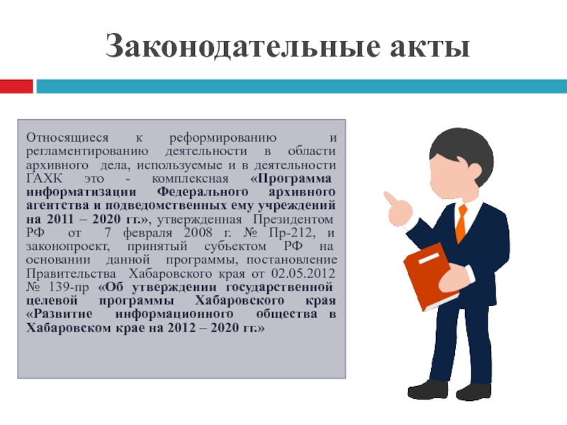 информатизации Федерального архивного агентства и подведомственных ему учреждений на 2011 – 2020 гг.», утвержденная Президентом РФ от 7 февраля 2008 г. № Пр-212, и законопроект, принятый субъектом РФ на основании данной программы, постановление Правительства Хабаровского края от 02.05.2012 № 139-пр «Об утверждении государственной целевой программы Хабаровского края «Развитие информационного общества в Хабаровском крае на 2012 – 2020 гг.»