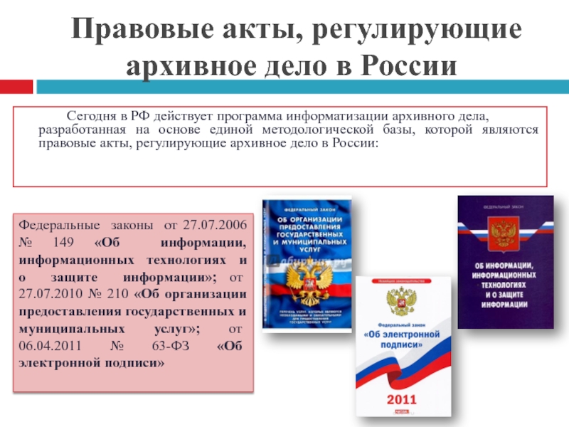 Слайд 3 Правовые акты, регулирующие архивное дело в России