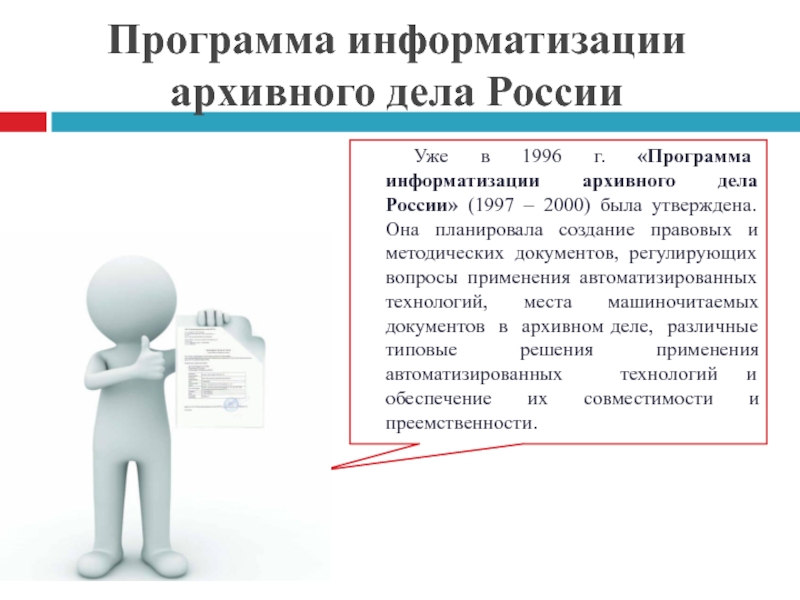 архивного дела России» (1997 – 2000) была утверждена. Она планировала