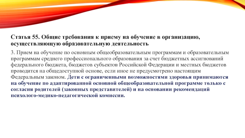 Слайд 9Статья 55. Общие требования к приему на обучение в организацию,