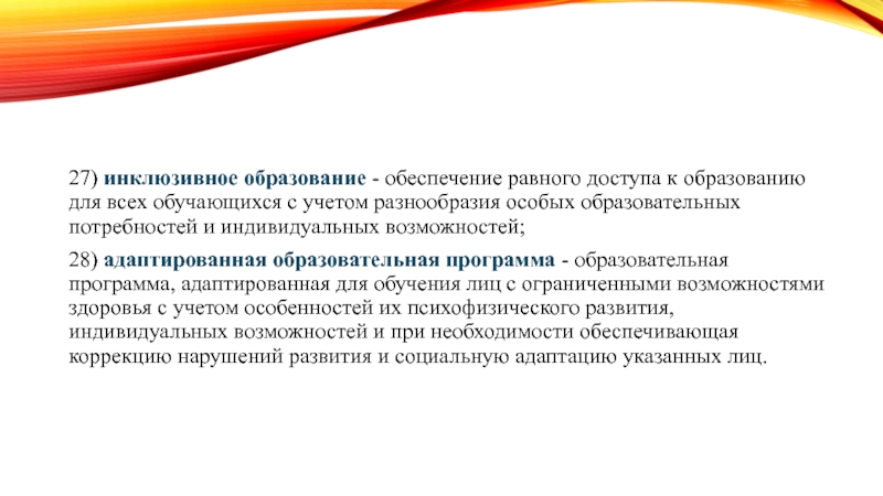 28) адаптированная образовательная программа - образовательная программа, адаптированная для обучения лиц с ограниченными возможностями здоровья с учетом особенностей их психофизического развития, индивидуальных возможностей и при необходимости обеспечивающая коррекцию нарушений развития и социальную адаптацию указанных лиц.
