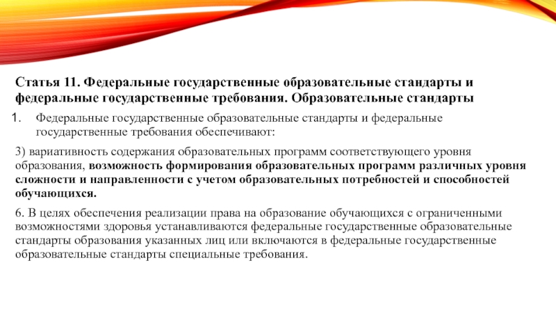 Слайд 6Статья 11. Федеральные государственные образовательные стандарты и федеральные государственные требования.