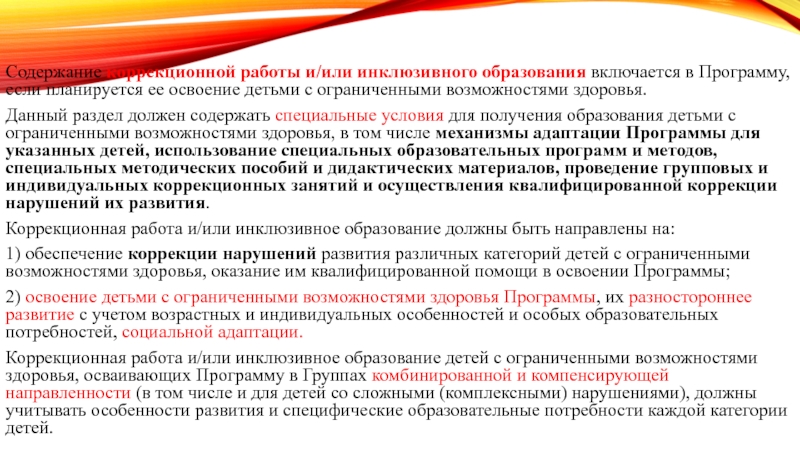 3. Под специальными условиями для получения образования обучающимися с ограниченными возможностями здоровья в настоящем Федеральном законе понимаются условия обучения, воспитания и развития таких обучающихся, включающие в себя использование специальных образовательных программ и методов обучения и воспитания, специальных учебников, учебных пособий и дидактических материалов, специальных технических средств обучения коллективного и индивидуального пользования, предоставление услуг ассистента (помощника), оказывающего обучающимся необходимую техническую помощь, проведение групповых и индивидуальных коррекционных занятий, обеспечение доступа в здания организаций, осуществляющих образовательную деятельность, и другие условия, без которых невозможно или затруднено освоение образовательных программ обучающимися с ограниченными возможностями здоровья.