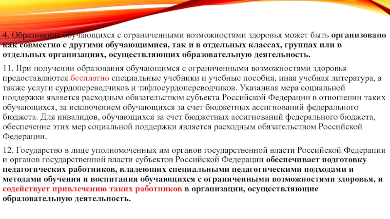 12. Государство в лице уполномоченных им органов государственной власти Российской Федерации и органов государственной власти субъектов Российской Федерации обеспечивает подготовку педагогических работников, владеющих специальными педагогическими подходами и методами обучения и воспитания обучающихся с ограниченными возможностями здоровья, и содействует привлечению таких работников в организации, осуществляющие образовательную деятельность.