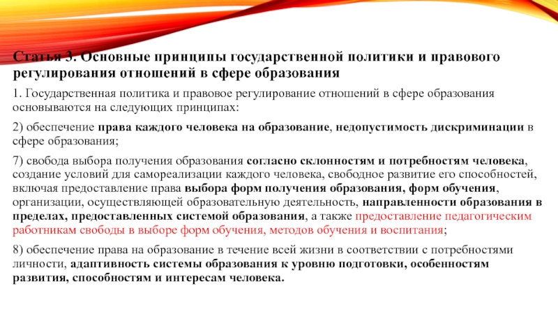 Слайд 4Статья 3. Основные принципы государственной политики и правового регулирования отношений