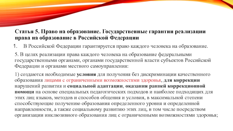 Слайд 5Статья 5. Право на образование. Государственные гарантии реализации права на