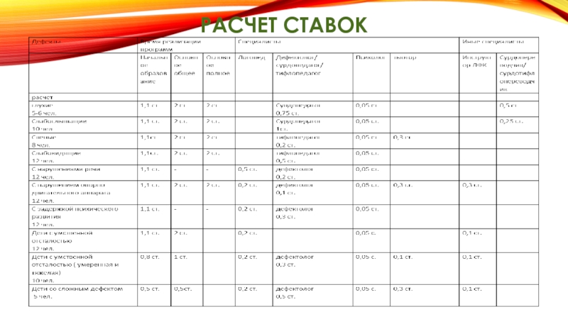 0,25 единицы учителя-логопеда; 0,25 единицы учителя-дефектолога; 0,25 единицы медицинской сестры по массажу; 0,25 единицы медицинской сестры по физиотерапии - из расчета на 1 группу; 0,25 единицы инструктора физкультуры из расчета на 2 группы (при наличии бассейна);