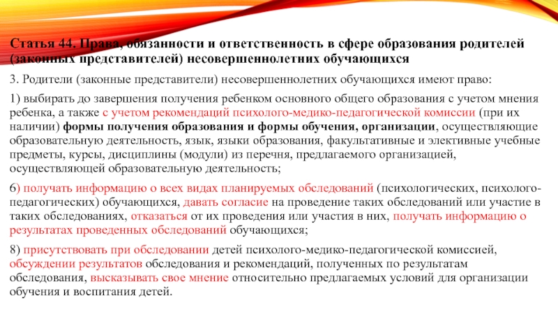 Слайд 7Статья 44. Права, обязанности и ответственность в сфере образования родителей