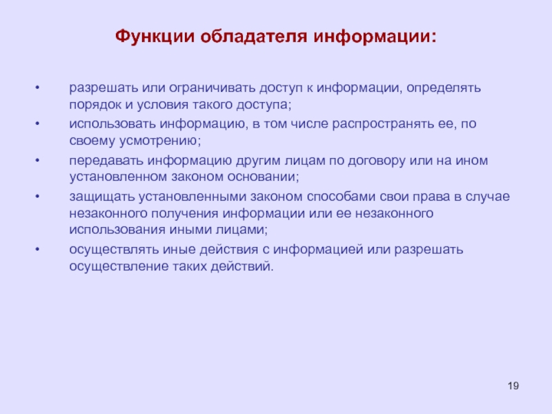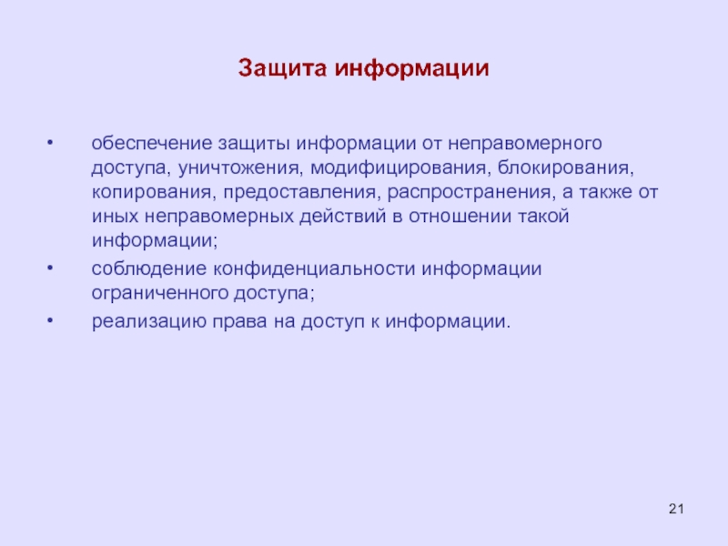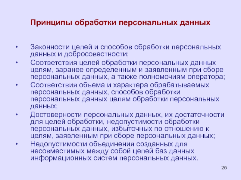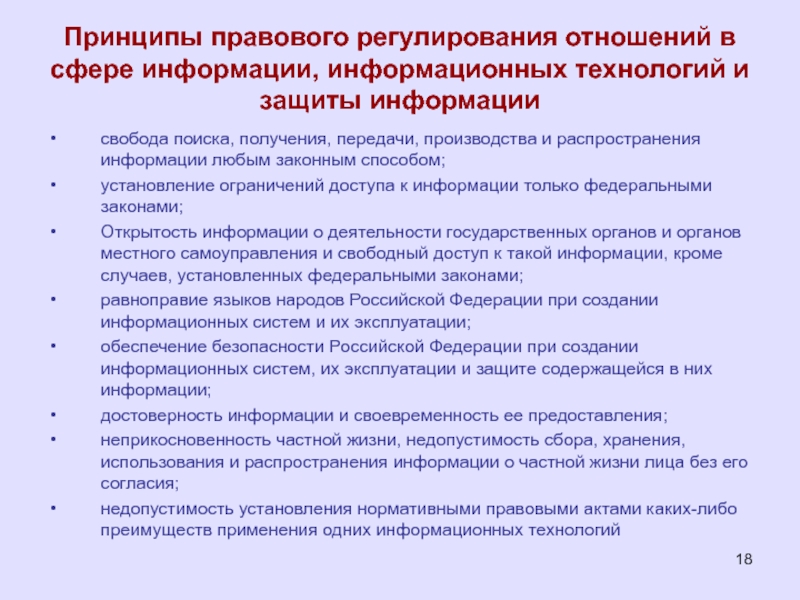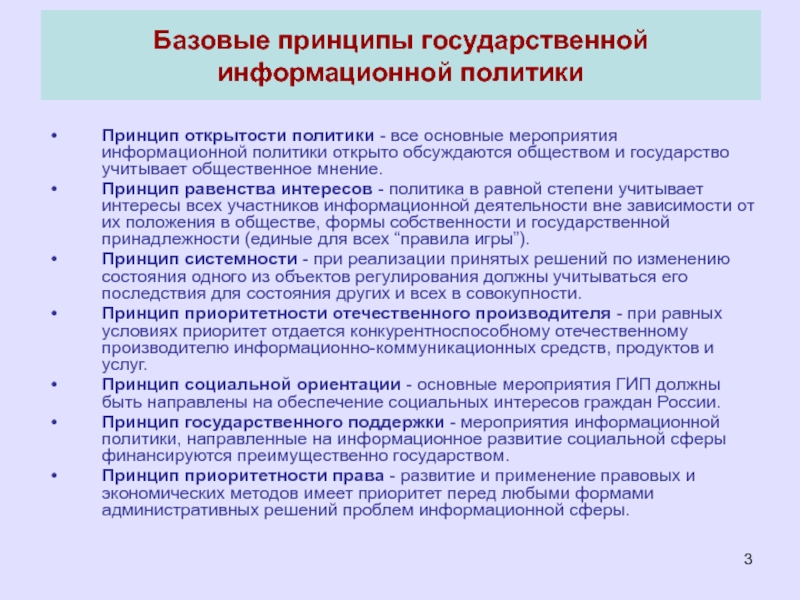 Принцип приоритетности права - развитие и применение правовых и экономических методов имеет приоритет перед любыми формами административных решений проблем информационной сферы.