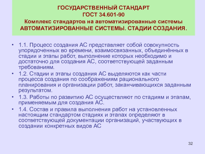 1.4. Состав и правила выполнения работ на установленных настоящим стандартом стадиях и этапах определяют в соответствующей документации организаций, участвующих в создании конкретных видов АС